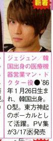 Jaejoong / Representante de ventas de productos sanitarios y médico,de origen coreano. Nacido 26 de enero 1986. Origen, Tipo de sangre O. El vocalista de Tohoshinki. Resumen de los PVs se estrenará el Miércoles 17 de marzo.