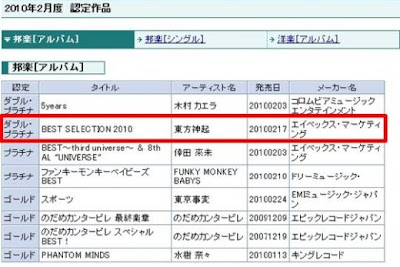 El grupo masculino Tohoshinki lanzó su primer Album del Año en Japón en febrero pasado y Recording Industry Association de Japón ha otorgado a su primera calificación de doble platino.Recording Industry Association de Japón anunció recientemente a través de su sitio web oficial de la categoría de álbumes y DVDs los números de ventas que se liberaron desde enero pasado. Entre los mejores álbumes, Tohoshinki "MEJOR SELECCIÓN 2010" se ha vendido por más de 500.000 copias por lo tanto se le dio el lugar en el rating de "Doble Platino'